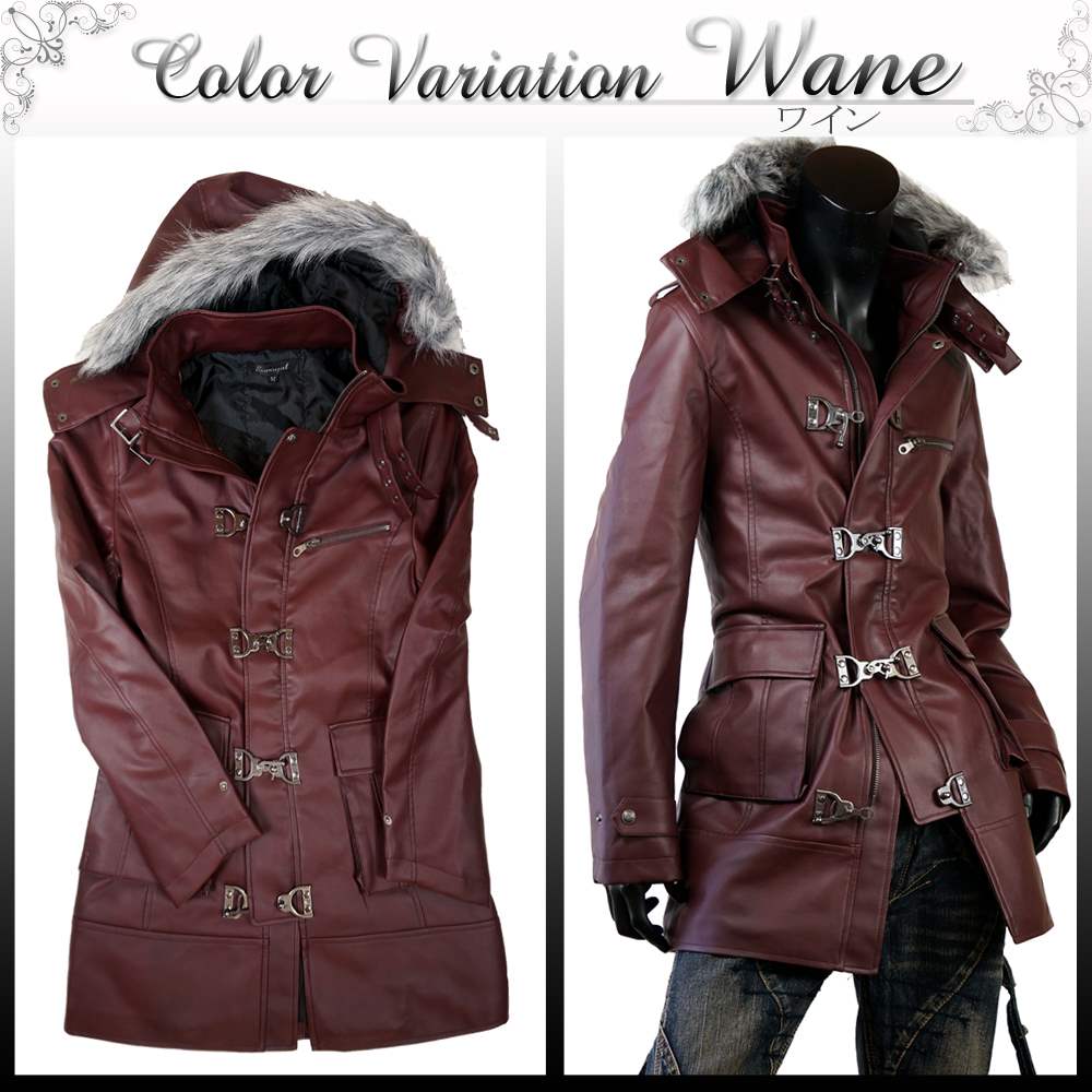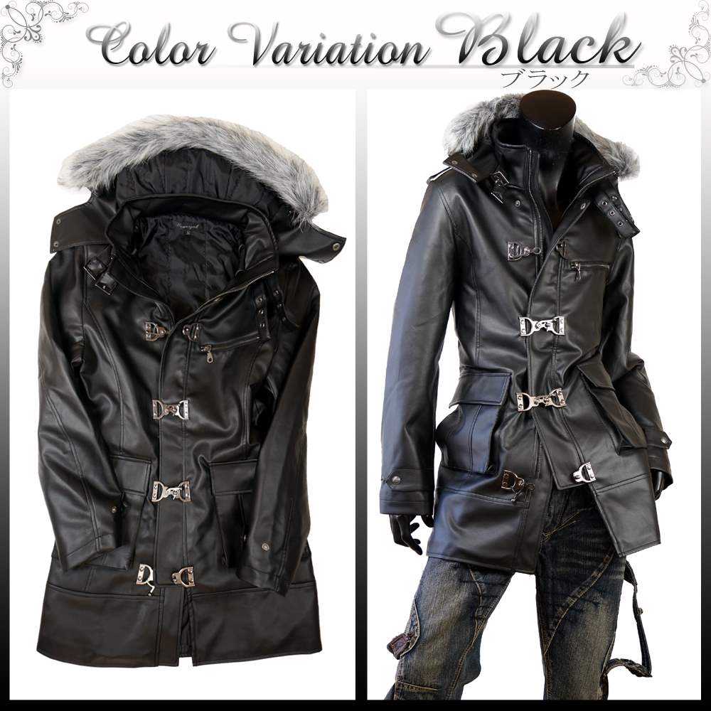 PUレザーの薄中綿入りファーコートはファイヤーマンフックで飾ったミリタリー仕様。