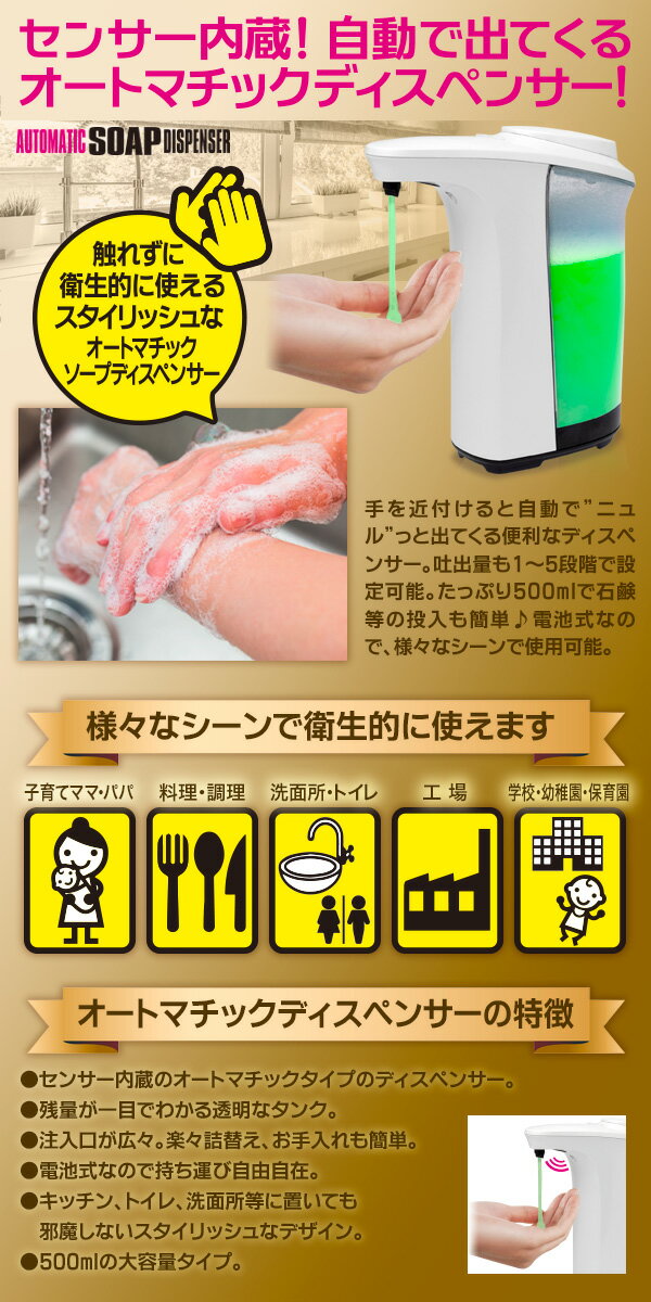商品名 自動ソープディスペンサー 容 量 最大500ml カラー ●ホワイト●ブラック●ワイン●シルバー 材 質 ●本体:AS樹脂●ふた:ABS樹脂●脚:TPE●パッキン:シリコン サイズ ●上部横:17cm●下部横:10cm●幅(最大):8.5cm●高さ(最大):18.5cm 備 考 ●電源:単三電池×4本※付属していません。
