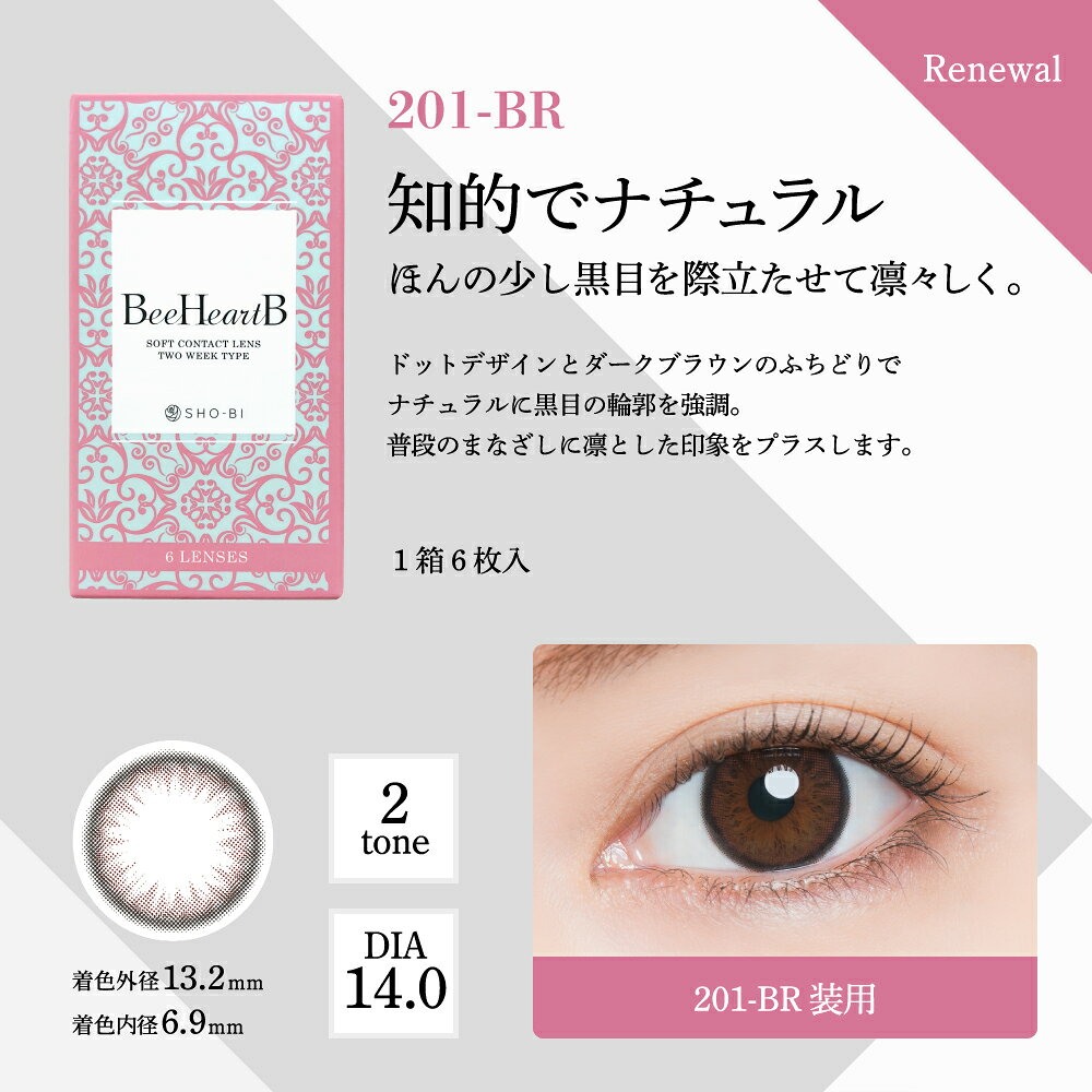 大変お待たせしました!!! 皆様の沢山のお声にお応えして・・・ ビーハートビー2ウィークの人気カラーを入荷しました!!! 日本人女性が持つ瞳の魅力を引きだすブランド【BeeHeartB】2weekタイプ 誰にも媚びない自然体な美しさ、 日本人の奥ゆかしくも芯の強さを秘めたまなざし、 “世界がうらやむ日本の美しい瞳”を【BeeHeartB】は再現しました! ちゅるんとした瞳『201-BR』はダークブラウンの輪郭がフチを自然に強調し、凛とした印象に。